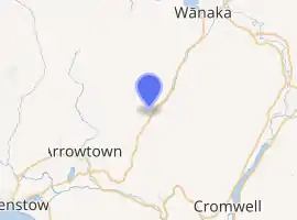 Cardrona is the name of a locality in the Cardrona Valley in New Zealand, with the nearby skifield of Cardrona Alpine Resort and Mount Cardrona also using the same name. Established as a gold rush township in the 1860s[3] on the banks of the small river of the same name, it is known for its distinctive hotel of gold rush vintage which is on the opposite side of the river to the original township of which few buildings remain. It is in a scenic setting on the Crown Range road which connects Wanaka and Queenstown.