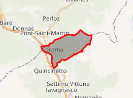 Carema borders the following municipalities: Perloz, Lillianes, Donnas, Pont-Saint-Martin, Settimo Vittone, and Quincinetto. It is home to the production of the Carema red wine.