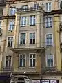 The facade, though worn out by time, display several details, related to Art Nouveau style. The portal is flanked by columns that joins above a transom light adorned with vegetal motifs. The main wooden door is intertwined with a delicate wrought-iron lace. Overhanging the portal, a large bay window towering through three levels ends up with a terrace. On both side, on can notice wrought-iron balconies, bearing different motifs, crowned at the hird floor by loggias. The top gable of the elevation is curved, enhanced on each side by eyelid dormers.