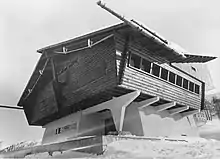 Just as the war ends, he puts into practice his ideas about architecture as language by designing the most influential of his buildings, the Lago Nero Sled Station (Slittovia del Lago Nero, 1946-1947). Its structure is made up of cutting-edge Vierendeel trusses integrated with a traditional interlocking log enclosure; Mollino thus created an extraordinarily dynamic and three-dimensional building. The building, which he himself defined a "flying chalet", is inspired by the traditional Walser alpine architecture that Mollino studied[10] in the summer of 1930 and for which he produced remarkably analytical drawings. The Lago Nero Sled Station is part of a group of projects such as the unbuilt Casa Capriata (1945) and the Casa del Sole (1945-54) in Cervinia that are inspired by traditional vernacular architecture reworked in modernist terms.