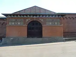 The building is constructed in red brick. The frieze with cranes on the facade was created by the artist Hansen Rejstrup.