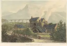 The first industrial canal in Wales was built in 1768 to convey coal from the Gwendraeth Valley to the coast, and the following year, the earliest tramroad bridge was on the tramroad built alongside the canal.[6] During the Napoleonic Wars (1799–1815) there was increased demand for coal, iron and agricultural goods, and the county prospered. The landscape changed as much woodland was cleared to make way for more food production, and mills, power stations, mines and factories sprang up between Llanelli and Pembrey.[6] Carmarthenshire was at the centre of the Rebecca Riots around 1840, when local farmers and agricultural workers dressed as women and rebelled against higher taxes and tolls.[8]