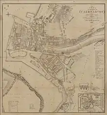 Carnarvon Castle railway station was opened in 1856 by the narrow gauge Nantlle Railway near the foot of what is today the Allt Y Castell which slopes down to Caernarfon's harbour area.[4] It was the line's northern terminus and was the closest of Caernarfon's ultimately five stations to the historic town centre.[5][6]