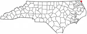 Carova Beach or Carova is an unincorporated community in Currituck County in the extreme northeastern corner of North Carolina, United States. The community, begun in the 1960s, is found on Currituck Banks, north of Bodie Island, and can be accessed only by boat or by four-wheel drive vehicle. There are no paved roads connecting Carova to the town of Corolla, North Carolina. The neighboring settlement of Sandbridge in Virginia Beach, Virginia is not accessible by vehicle from Carova. In the 1960s, when development began in Carova, there were plans to construct a paved road from Sandbridge south to Carova through the Back Bay National Wildlife Refuge, but these never materialized. Today, there is a permanent fence from ocean to sound to keep vehicles from crossing and, more importantly, to keep the wild horses from migrating to the Virginia side of the border. To reach Carova, four-wheel drive vehicles must drive north along the beach from Corolla into the community, as access from Virginia is limited to pedestrians and bicyclists.