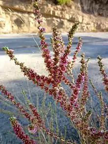 Caroxylon vermiculatum is a small, greyish, much-branched shrub ranging in height from 25 to 100 cm (10 to 40 in). The branches themselves branch repeatedly and are wiry and woody at the base. The leaves are tiny and scale-like, clasping the stem and covered with minute hairs. The inflorescence is a leafy spike with solitary flowers in the axils of the leaves. The flowers have persistent, pinkish, winged sepals and no petals and are about 10 mm (0.4 in) in diameter.[2]