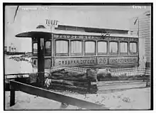 In the 1850s and 1860s local San Francisco transit companies used horse-drawn railcars on city streets. The arrival of cable cars and electric streetcars spelled the doom of the equine-pulled variety.[2] In 1895 the Market Street Railway Company placed a newspaper advertisement in the San Francisco Examiner offering horsecars for $20 ($10 without seats). By September of that year the cars were already put to a wide variety of uses, including a backyard children's playhouse, a real estate office, a shoemaker's shop,[3] and a shelter for poor people in North Beach.[4] Colonel Charles Dailey had moved with his wife in 1893 to a hut on a plot rented from Adolph Sutro in the then-unsettled expanse of sand dunes near Ocean Beach. He rented a horse car from Sutro and in it opened "The Annex", a "coffee saloon", catering to day trippers taking the Park and Ocean Railroad out of the city to the beach and the Cliff House. This became the nucleus of a colony of former cars near the Great Highway,[5] especially after real-estate agent Jacob Heyman started advertising lots for $7.50 a month rental, $35 including two horse cars.[4] By 1897 the area had become known as "Carville-by-the-Sea" or simply "Carville".