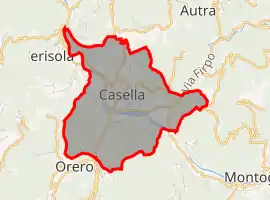 Casella is a comune (municipality) in the Metropolitan City of Genoa in the Italian region Liguria, located about 14 kilometres (9 mi) northeast of Genoa. As of 31 December 2004, it had a population of 3,131 and an area of 7.8 square kilometres (3.0 sq mi).[3]