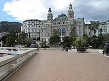 The Casino Gardens and Terraces are public gardens that surround the Monte Carlo Casino in the Monte Carlo district of Monaco. The gardens contain lawns and fountains and a "Little Africa" garden. At the bottom of the terraces is Victor Vasarely's artwork Hexa Grace, made of multi coloured tiles.[1] The gardens were founded in the late 19th century and formed the largest public space in Monaco in the 1950s.[2] The gardens are frequently used to display large public artworks.[3] The gardens were designed by the architect Edouard André. The original designs for the garden incorporated waterfalls stretching down a slope to terminate in a pond amidst sunken gardens. The trees washingtonia robusta and brachychiton populneus are prominent in the gardens.[1]