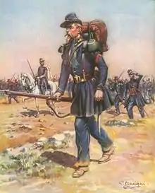 By the late 18th century/early 19th century, European military uniform had developed from a relatively easy-fitting, all-purpose coat/waistcoat-tunic/breeches/hat 'suit' of clothes worn by soldiers for all occasions into a separate formal parade-style uniform with stiff shako cap and another secondary simple uniform with soft cap for all other purposes. As most European armies' enemies would be other European armies, it was accepted convention that only the best-dress uniform was to be worn into battle, though concession may be given to vagaries of weather. However, countries with expanding colonies, such as Great Britain, did not see the same need for formality whilst fighting its colonial wars and secondary uniforms with local modifications, tended to be worn.[1] France too adopted this thinking when it embarked on a programme of colonial expansion into Algeria in 1830.[2]