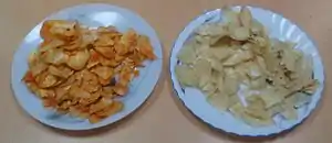 In Nagaland and Mizoram in Northeast India, tapioca is eaten as a snack. It is usually boiled with a bit of salt in water after skinning it, or snacks are made by drying the tapioca after cutting it. It is then powdered into flour and turned into dough to either make a fired or baked biscuit. In their local dialect, they call it kuri aloo, meaning "wood potato". These chips are eaten by all groups of society as a delicacy. The skin of the tapioca, which is not edible for humans, is kept aside to prepare a food for domesticated pigs.