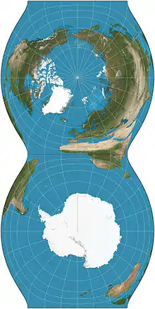 The Cassini projection (also sometimes known as the Cassini–Soldner projection or Soldner projection[1]) is a map projection described by César-François Cassini de Thury in 1745.[2] It is the transverse aspect of the equirectangular projection, in that the globe is first rotated so the central meridian becomes the "equator", and then the normal equirectangular projection is applied. Considering the earth as a sphere, the projection is composed of the operations: