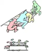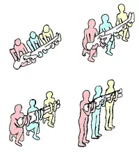For this, two team members are placed on each side of the casualty; they place one hand under the buttock, the other under the opposite armpit; the casualty places his/her arms around the neck of the team members. A third team member lifts the legs as usual, and a fourth pushes the stretcher.