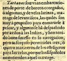 José Veitia Linaje (1670) refers to the tartanes as levantisco tide, being used in navigation to the Indies. In the work Norte de la Contratación (Seville, 1672), he points out that: "Tartanes... of Latin sails, lifting of levantisks... but it is necessary to allow them 3 or 4 sailors from foreigners ("levantisks") for the sails, because the Spaniards do not understand their maneuver"..." (referring to the maneuver of the Latin sails). Veitia was the Official Judge of the Royal Audience of the Casa de Contratación de las Indias.[17][21] Reinforcing this fact, the Bulletin de la Société de géographie explains that "a 14-year-old boy practical of a Catalan tartane, at that age had already made the trip to Havana three times".[22]