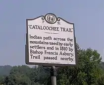 The Cataloochee Trail, which stretched from the Cove Creek area to what is now Cosby, Tennessee, connected the Cherokee Middlesettlements with the Overhill towns. The modern Cove Creek Road closely parallels this trail.[3] By the time the first European explorers and traders arrived, the trail had been worn a foot deep in some places. Bishop Francis Asbury used it to cross the mountains into Tennessee in 1810.