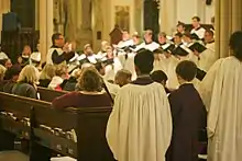 The cathedral is historically known for its music ministry, led by Canon Lawrence Tremsky (Northwestern University, M.M.). The Men & Boys Choir, which originated during the 19th century, was the reason that the train station in the area was initially constructed - to transport the boys from their homes in Brooklyn or Manhattan to rehearsals and services. During the 1930s, the cathedral formed the first American cathedral girls' choir - known as the Schola Cantorum. The choirs sing a repertoire of choral music, from plainsong to modern works, selected carefully to coincide with the themes of the season. Evensong is sung on the first Sunday of each month in the traditional English cathedral model (Magnificat, Nunc Dimittis, an anthem, and Anglican chant psalms). Special seasonal liturgies include traditional "Lessons & Carols" one or two Sundays before Christmas.