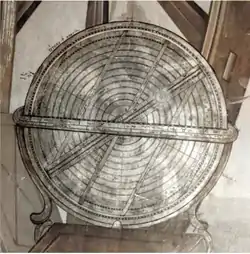 The five parallel celestial circles outline six zones. A greek phrase is written on the outer circle outlining the different phases of the sun. The instrument features attributes of the sun written in Greek. In the north, it outlines: frigid, temperate, and torrid. In the south, it outlines: torrid, temperate and frigid. The painter also adds a zodiac circle on the slanted line of the instrument. It also features the symbols for Libra, Scorpio, Sagittarius, Capricorn, Aquarius and Pisces. The lines are separated by degrees. The instrument also features a calendar and a meridian ring. The instrument closely resembles an astrolabe. His contemporaries added an armillary sphere or a celestial globe in their versions of his painting.[9]