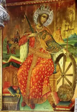Saint Catherine was an educated woman and princess from Alexandria, Egypt. She was alive from 287 to 305. She died seven years before Constantine recognized the new Christian religion. She was tortured by Emperor Maxentius because she converted hundreds of people to the new Christian faith. She was almost put to death by a spiked wheel. She is often depicted in art as an educated woman with a spiked wheel. Palladas finished one of the most influential paintings of the figure for the iconostasis of Saint Catherine's Monastery in Mount Sinai, Egypt. It became the prototype for Catherine of Alexandria. During the same period, another Sinaitic monk named Theocharis Silvestros painted several versions of the prototype. Countless artists copied the work namely, Emmanuel Lambardos, Victor and Philotheos Skoufos.[2][3]