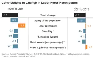 Economists at the Federal Reserve Bank of Atlanta reported in April 2016 that changes in the labor force participation rate reflect both aging (demographic) and behavioral aspects. They estimated the demographic effect was responsible for about half of the 3.4 percentage point decline between 2007 and 2015. However, the behaviors contributing to the remainder changed when measuring components of the 1.9 percentage point decline in 2007–2011 and the 1.5 percentage point decline in 2011–2015. Those persons wanting a job (who were still considered outside the workforce due to not actively searching for employment) contributed 0.7 percentage points to the decline in 2007–2011, but actually offset the decline in 2011–2015, indicating improving labor market conditions. From 2007 to 2015, later retirement was another factor offsetting the decline, while disability, more youth in school, and prime age workers not wanting a job contributed to the decline.[31]