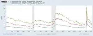 • Employment relative to civilian population: This measure also peaked in 2000 and fell during the 2001 recession, recovered during the housing bubble, then fell dramatically during the 2007–2009 recession and has stabilized thereafter. It has fallen significantly in each of the past three recessions. This trend is indicative of a primary effect from the recession and secondary effect of demographics.