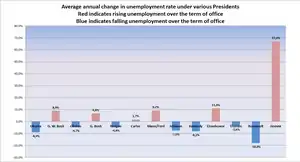 The values indicate the average annual rate of change in the unemployment rate over the years in office. 1945–present data is from Bureau of Labor Statistics Labor Force Statistics; data prior to 1945 is from McElvaine's The Great Depression, Three Rivers Press (2009), Chapter 4