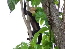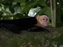 Like other monkeys in the genus Cebus, the Panamanian white-faced capuchin is named after the order of Capuchin friars – the cowls of these friars closely resemble the monkey's head coloration.[7][8] The Panamanian white-faced capuchin has mostly black fur, with white to yellow like fur on the neck, throat, chest, shoulders, and upper arms.[9] The face is pink or a white-cream color and may have identifying marks such as dark brows or dark fur patches.[9][10][11] An area of black fur on the crown of the head is distinctive.[9][12] It has a prehensile tail that is often held coiled, giving the white-faced capuchins the nickname "ringtail".[9][13]