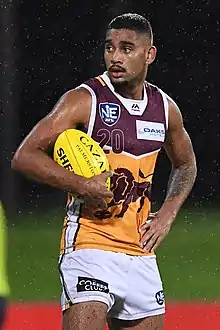 He was drafted by the Brisbane Lions with their fourth selection and twenty-fourth overall in the 2016 national draft.[1] He made his debut in the fifty-two point loss against Richmond at the Gabba in round four of the 2017 season.[2] On 24 May 2017, it was announced that he would wear number 67 on his jersey, rather than his usual 20, for the round 10 Sir Doug Nicholls Indigenous Round game against Collingwood. This was to commemorate the 1967 referendum (which allowed Indigenous Australians to be counted with the general population in the census and thus be treated separately in legislation).[3] However, he was not picked to play in the game.