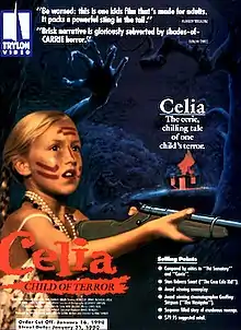 Celia was released on VHS in the United States by Trylon Video in December 1989 as Celia: Child of Terror.[12][13] It was later issued on DVD by Second Run on 30 March 2009, and subsequently released on DVD by Scorpion Releasing on 26 February 2013.[14] In December 2021, the film was released on Blu-ray by Severin Films as part of the "All the Haunts Be Ours" box set, a compendium of international folk horror films.[15]