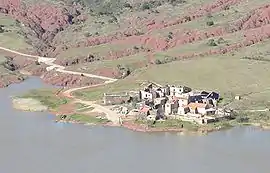 The village sits on the bank of Lac du Salagou. When the dam that created the lake was built (1964–68), the intention was to raise the water level in two stages—first to 139m, then to 150m. The second stage would have engulfed the village of Celles, which is at a mean altitude of 144m, and accordingly the village and its vineyards were officially abandoned. The first stage of water level left the water lapping at the foot of the village without encroaching on any structures. The second stage was never implemented, so a few villagers re-occupied the Mairie, repairing public buildings in order that the status of Celles as a commune would be preserved. However, the French authorities are allowing the village to decay and all buildings except the Mairie and the church are in ruins. It is a popular place for fishing and picnics.