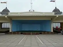 It was first called the New Bandstand, and then the Central Bandstand, to differentiate it from other bandstands in Herne Bay, especially the bandstand which stood on the roof of the King's Hall and has since been demolished. The north or seaward side of the Central Bandstand was built in 1924, with alterations in 1931.[5] The original architect was Herbert Kempton Dyson, M.I.Struct.E (1880–1944), who was a founder member of the Concrete Institute, and specialised in reinforced concrete structures.[3][6][7] The 1924 section has two outside seaward-facing balconies with space for deckchairs, including a cantilevered roof for the lower deck and for covering the stage inside. Metal, glazed screens at the east and west sides of the building crossed the promenade, and could be moved to protect the audience from wind, or retracted into the wings to allow promenaders to cross when no band was playing.[4][6] The seating area was a railed-off section of the promenade, and the seating on the roof above the stage included two copper-covered domes, plus two domes which doubled as refreshment kiosks.[4] The roof is now inaccessible for safety reasons.[4] By the late 1920s the audience area in front of the stage had extended across Tower Gardens to the edge of the footpath and road.[8]