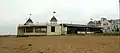 The Central Bandstand with its 1932 frontage has been described as an art deco landmark, and one of the first reinforced concrete structures in the UK.[2][3] It straddles the beach and Central Parade just east of the Clock Tower. The back or seaward half, built in 1924, was originally supported above the beach on concrete pillars sheathed in cast iron, so that the stage was level with the main thoroughfare.[4] The tide used to go in and out under the building until at least the 1950s. During World War II when the Pier was out of bounds, anglers were permitted to fish from the rooftop balcony.[5] As of 2013 the beach has risen so that the piers are no longer visible and the sea has receded away from the Bandstand.