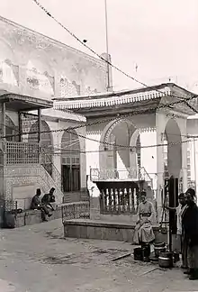 The chief synagogue is very ancient and has many peculiarities. There are several modern additions to it, but the main structure is dated by the Abbe Chagnot as early as the fourth century. It has several inscriptions, some carved on its walls, others painted on them. One is as late as 1861, another as early as 834. The latter is on a chapel stated to have been erected by Mar Ali ben Nathan b. Mebasser b. HaAram....Hebrew inscription... Only four letters are starred, so that the date is probably 1145, sel.=834. The local Jews, however, assume that all the letters count in the perat, but that no thousand is omitted, so that the date would be 654 sel., i.e., 345 of the common era! The letters are certainly archaic, so early an inscription should not be accepted as such without further evidence. There are several chapels surrounding the main building, evidently added from time to time, as the community grew. In each of these minyan is separately held. The chief peculiarity of the Aleppo synagogue is a raised pulpit called the Kiseh Eliyahu approached by a flight of some twenty steps and still used for the solemnization of a Brit milah. Over the synagogue there is a yeshivah and in a secret chamber in the eaves of the roof of one of the side chapels is the genizah.