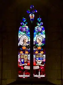 Above the exterior entrance into the foyer is a stained glass window commemorating the Diamond Jubilee of Queen Elizabeth II. Designed by Christopher Goodman and Angela Zissoff of Kelowna, British Columbia, with input from the Speaker of the Senate, Noël A. Kinsella, and the Canadian Secretary to the Queen and Usher of the Black Rod, Kevin MacLeod, and approved by the Queen,[27] the window shows Elizabeth and Queen Victoria with their respective royal cyphers and renditions of the Centre Block during the reign of each monarch.[28][29] A gift to the monarch from the Senate, it was constructed over six weeks from 500 pieces of machine made and mouth-blown glass from France, the United Kingdom, Germany, and the United States.[27] The Queen unveiled a model at Rideau Hall on 30 June 2011 and, after the finished piece's installation, the window was dedicated by Governor General David Johnston on 7 February 2012.[30]