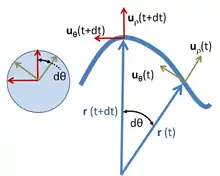 - Notice that this local coordinate system is not autonomous; for example, its rotation in time is dictated by the trajectory traced by the particle. The radial vector r(t) does not represent the radius of curvature of the path.