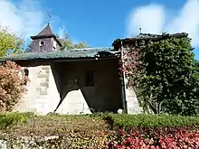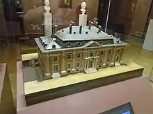 In 1760-61 Voltaire converted a barn near the château into a private theatre.[17] This theatre presented the premieres of various plays authored by Voltaire, and he used this local stage to test his work before making any changes and having it performed in Paris. Following a later expansion it could accommodate up to 200 spectators to the great pleasure of the Genevans, whose Republic had banned the theatre.[14] While Voltaire still resided at Ferney the theatre was repurposed as a silk factory[17] and the entire structure was demolished in 1798.[5]