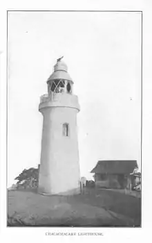 Chacachacare Lighthouse was an active lighthouse located in the north part of Chacachacare atop a hill at an elevation of 236 metres (774 ft). The tower was built in 1897 in masonry with a cylindrical shape with balcony and lantern which is positioned at a height of 251 metres (823 ft) above sea level. The tower is painted white and has a height of 15 metres (49 ft), the lantern is painted red. While the lighthouse was active, it emitted one white flash in a ten seconds period visible up to 26 nautical miles (48 km; 30 mi).