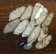 | Chalybion sp. wasp reusing an old nest of Sceliphron sp. Note the different white material used to cap the cells | |