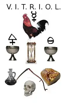V.I.T.R.I.O.L. or V.I.T.R.I.O.L.U.M. Meaning;("visita interiora terrae, rectificandoque, invenies occultum lapidem", or "visit the interior of the earth, and purifying it, you will find the hidden stone." This is another way of saying " look within yourself for the truth".) This phrase must be present in all chambers of reflection directly facing the candidate.