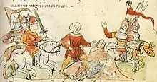 Grand Prince Vladimir (wielding a sword) beholds enemy forces withdraw as his champion Nikita the Tanner defeats the Pecheneg champion. Detail of a medieval chronicle