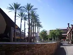 Adjacent to the food court entrance of the mall is an outdoor entertainment and dining plaza called The Village. The entertainment and dining options at The Village include the Harkins Theatres, Escape the Room, The Old Spaghetti Factory, Buffalo Wild Wings, BJ's Restaurant & Brewhouse, California Pizza Kitchen, PLAYlive Nation, and a Starbucks. A popular attraction of the outdoor plaza used to be the Dancing Waters fountain featuring a display of water, lights and music. The fountains were later demolished in the Summer of 2014 and renovated into a picnic area that featured patio seating, lawn areas, and a children's splash pad.