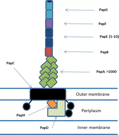 All chaperone/usher systems are found within gene clusters consisting of at least an usher, a chaperone and one or more fimbriae subunits.[1] Overall the system includes periplasmic chaperones, periplasmic and extracellular pilus subunits, dimeric usher outer membrane pore and associated Sec machinery. The Pilus subunits polymerise via a non-covalent interaction to form the mature pilus which consists of an adhesive tip, helical body and an usher bound base. The P-pilus (pap) system is one of the best characterised and is shown below.[2]