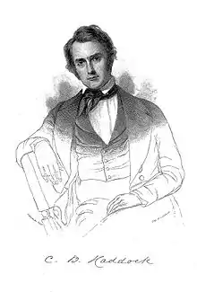 Haddock married twice: on 19 August 1819 to Susan Saunders Lang (12 November 1796, Hanover, New Hampshire - 17 August 1840) in Hanover, New Hampshire, and on 21 July 1841 to Caroline Young Kimball (18 December 1807, Lebanon, New Hampshire - 7 March 1892, Hanover, New Hampshire) in Hanover. In the late 1820s Haddock was accused of committing adultery with Emeline Colby Webster, a relative of Daniel Webster, and Haddock was defended by his brother William Townsend Haddock, a nephew and former student of Webster.[4] The writer, Grace Webster Haddock Hinsdale, was his daughter from his first marriage.[5]