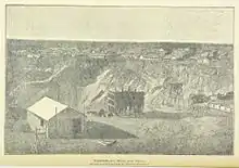 When Coghlan arrived to join his brother in 1882, Kimberley was a town of 22,000 in search of riches, according to John Smith Moffat.[7] That same year, Cecil Rhodes incorporated the De Beers Mining Company and in 1883 was elected to the Cape Parliament as Member for the newly enfranchised Diamond Fields.[8] Kimberley had come into being after diamonds were found on the De Beers brothers' farm on Colesberg Kopje in 1869.[9] Initially dubbed "New Rush", the site was renamed after Lord Kimberley, the British Secretary of State for the Colonies, in 1873.[10] It was respectively 5 miles (8 km) and 40 miles (64 km) from the Orange Free State and the South African Republic (or Transvaal),[11] the latter of which had just had its independence restored following the First Boer War of 1880–81.[12]