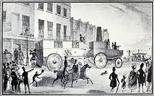 He was financially interested in several of the companies which were organized to run steam coaches over the common roads. He was the backer of Goldsworthy Gurney, and was also engaged in building for himself. His most famous car was a coach that ran every day from the Strand, London, to Brighton. This was an engine mounted on four wheels with a tall rectangular funnel that narrowed towards the top. Above the engine were seats for six or seven persons besides the driver. On the roof there were places for four passengers, and on a board behind stood the footman. The carriage was one of the spectacular sights of London at that time and great crowds gathered in the Strand every day to witness its departure.