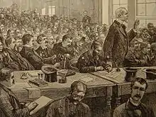 Guiteau's interest then turned again to politics. During the 1880 presidential campaign, the Republican Party was largely split into factions – the Stalwarts, led by Roscoe Conkling, who supported Grant for a third term, and the Half-Breeds, who supported James G. Blaine. Guiteau decided to support the Stalwarts and wrote a speech in support of Grant called "Grant against Hancock", which he revised to "Garfield against Hancock"[19][20] after Garfield (not affiliated with either faction) won the Republican nomination. Ultimately, Guiteau changed little more in the text than switching Grant's name for Garfield's.[21] The speech was delivered at most twice, and printed copies were passed out to members of the Republican National Committee at their summer 1880 meeting in New York, but Guiteau believed himself to be largely responsible for Garfield's victory over Democrat Winfield Scott Hancock that November.[22] He insisted he should be awarded a consulship for his supposedly vital assistance, first asking for Vienna, then deciding that he would rather have the one in Paris.[22] Guiteau's personal requests to Garfield and his cabinet as one of many job seekers who lined up every day to see them in person were continually rejected, as were his numerous letters.[22]