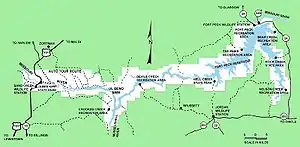 The refuge extends for 125 miles (201 km) air miles along the Missouri River from Fort Peck Dam to the Fred Robinson Bridge on U.S. Route 191.[39] The UL Bend National Wildlife Refuge (about half of which is contiguous with the UL Bend Wilderness) is located adjacent to the western section of the CMR NWF north of the "UL Bend" in the Missouri River.[40] The far eastern portion of the 80-mile (130 km) long Missouri Breaks National Back Country Byway is also contained within the refuge.[19] The western boundary of the CMR NWF abuts the Upper Missouri River Breaks National Monument.[40] The refuge also incorporates portions of six Montana counties. From west to east they are Fergus, Phillips, Petroleum, Garfield, Valley, and McCone counties.[40]