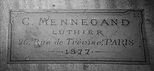 Charles Mennégand used a reddish-brown spirit varnish with golden highlights and he was very particular about using carefully chosen wood of an even and medium grain. He signed his work internally "C. Mennegand" or used printed labels reading Mennégand / Luthier / 26 rue de Trévise, Paris or C. Mennégand luthier / 26, rue de Trévise, Paris.