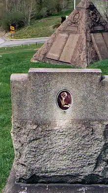 Russell's health declined markedly in the three years leading up to his death. During his final ministerial tour of the western and southwestern United States, he became increasingly ill with cystitis,[57] but ignored advice to abandon the tour.[58] Russell died on October 31, 1916, at age 64 near Pampa, Texas, while returning to Brooklyn by train.[57][59][60][61][62][63] An associate of Russell stated that Russell's body at age 64 was more worn out than that of his father who died at age 84.[64] He was buried in United Cemetery, Pittsburgh. The gravesite is marked by a headstone; nearby stood a 7-foot-tall (2.1 m) pyramid memorial erected by the Watch Tower Bible and Tract Society in 1921.[65][66] The pyramid memorial was vandalized and subsequently removed in September 2021.