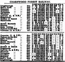 The Charnwood Forest Railway was a branch line in Leicestershire constructed by the Charnwood Forest Company between 1881 and 1883.[1] The branch line ran from Coalville (joined from the Ashby and Nuneaton Joint Railway (ANJR)) to the town of Loughborough.