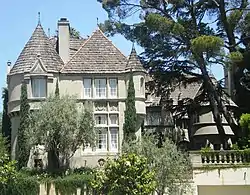 Designed by architect Percy Parke Lewis, Chateau Colline was built in 1935. Its leaded-glass windows, turrets, and climbing vines give it the appearance of a castle. The building also has large wood-burning fireplaces with handcrafted mantels, bakelite intercoms, vaulted ceilings and outside nooks for milk bottles.[2] The Los Angeles Times has reported that rumor has it that "Clark Gable and Bette Davis once lived there, holding lavish parties in a second-story apartment."[2]