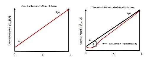 where R is the gas constant, and is the mole fraction of species i contained in the solution. The chemical potential becomes negative infinity when , but this does not lead to unphysical results because means that species i is not present in the system.